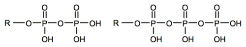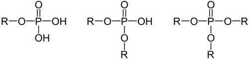 Organophosphates are a class of compounds encompassing a number of distinct but closely related function groups. These are primarily the esters of phosphoric acid and can be mono‑esters, di‑esters or tri‑esters depending on the number of attached organic groups (abbreviated as 'R' in the image below). In general man‑made organophosphates are most often triesters, while biological organophosphates are usually mono- or di-esters. The hydrolysis of triesters can form diesters and monoesters.[6]
