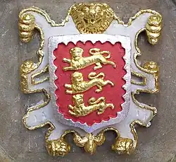 The college's coat of arms are blazoned: "Gules, three lions passant guardant or within a bordure engrailed argent".[57] In recognition of Oriel's foundation by King Edward II, the arms are based on the royal arms of England, which also feature three lions, with a bordure added as a mark of difference.[58] The blazoning was recorded at the Visitation of 1574.[59]