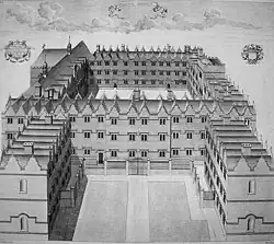 The Oriel Street site was acquired between 1329 and 1392.[22]: 29 Nothing survives of the original buildings, La Oriole and the smaller St Martin's Hall in the south-east; both were demolished before the quadrangle was built in the artisan mannerist style during the 17th century. The south and west ranges and the gate tower were built around 1620 to 1622; the north and east ranges and the chapel buildings date from 1637 to 1642.[8][11] The façade of the east range forms a classical E shape comprising the college chapel, hall and undercroft. The exterior and interior of the ranges are topped by an alternating pattern of decorative gables. The gate house has a Perpendicular portal and canted Gothic oriel windows, with fan vaulting in the entrance. The room above has a particularly fine plaster ceiling and chimney piece of stucco caryatids and panelling interlaced with studded bands sprouting into large flowers.[20]