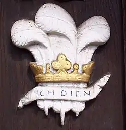 The Prince of Wales's feathers, often adopted as insignia by members of the college, appear as decorative elements within the college buildings and appear on the official college tie. It probably represents Edward, the Black Prince, Prince of Wales, who first adopted the device, the senior grandson of King Edward II, although it may represent King Charles I, who was Prince of Wales when the building of First Quad began in the 17th century.[57]