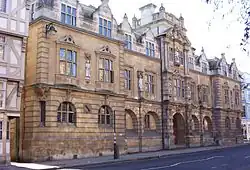 The Rhodes Building, pictured, was built in 1911 using £100,000 left to the college for that purpose by former student Cecil Rhodes.[20] It was designed by Basil Champneys and stands on the site of the house of the St Mary Hall Principal, on the High Street. Champneys's first proposal for the building included an open arcade to the High Street, a domed central feature and balustraded parapet. The left hand block and much of the centre was to be given up to a new provost's lodging, and the five windows on the first floor above the arcade were to light a gallery belonging to the lodging. The college eventually decided to retain the existing provost's lodging and demanded detailing "more in accordance with the style which has become traditional in Oxford". It became the last building of the Jacobean revival style in Oxford.[37]