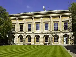 The north range of the Second Quad houses the library and senior common rooms; designed in the Neoclassical style by James Wyatt, it was built between 1788 and 1796 to accommodate the books requested by Edward, Baron Leigh, formerly High Steward of the university and an Orielensis, whose gift had doubled the size of the library.[36] The two-storey building has rusticated arches on the ground floor and a row of Ionic columns above, dividing the façade into seven bays – the ground floor contains the first purpose-built senior common rooms in Oxford, above is the library.[8]