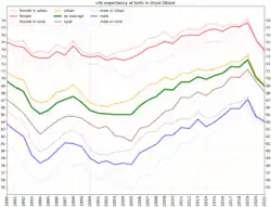Total — 68.97 years (male — 64.04, female — 73.81)