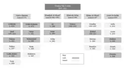 At age 17 in 1974, bin Laden married Najwa Ghanem at Latakia, Syria.[29] However, they later separated, and she left Afghanistan on 9 September 2001.[30] His other known wives were Khadijah Sharif (married 1983, divorced 1993); Khairiah Sabir (married 1985); Siham Sabir (married 1987); and Amal al-Sadah (married 2000). Some sources also list a sixth wife, name unknown, whose marriage to Bin Laden was annulled soon after the ceremony.[31] Bin Laden fathered 24 children with his wives.[32] Many of Bin Laden's children fled to Iran following the September 11 attacks, and as of 2010 Iranian authorities closely controlled them there.[33]