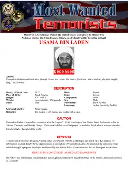 212. ^ "Five Years Ago Today – Usama Bin Laden: Wanted for Murder". Federal Bureau of Investigation. 5 November 2003. Archived from the original on 9 January 2008. Retrieved 27 May 2010.
