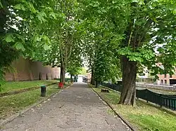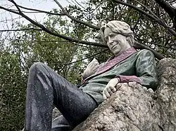Wilde did not meet Walter Pater until his third year, but had been enthralled by his Studies in the History of the Renaissance, published during Wilde's final year in Trinity.[44] Pater argued that man's sensibility to beauty should be refined above all else, and that each moment should be felt to its fullest extent. Years later, in De Profundis, Wilde described Pater's Studies... as "that book that has had such a strange influence over my life".[45] He learned tracts of the book by heart, and carried it with him on travels in later years. Pater gave Wilde his sense of almost flippant devotion to art, though he gained a purpose for it through the lectures and writings of critic John Ruskin.[46] Ruskin despaired at the self-validating aestheticism of Pater, arguing that the importance of art lies in its potential for the betterment of society. Ruskin admired beauty, but believed it must be allied with, and applied to, moral good. When Wilde eagerly attended Ruskin's lecture series The Aesthetic and Mathematic Schools of Art in Florence, he learned about aesthetics as the non-mathematical elements of painting. Despite being given to neither early rising nor manual labour, Wilde volunteered for Ruskin's project to convert a swampy country lane into a smart road neatly edged with flowers.[46]