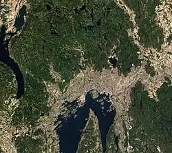 The municipality of Oslo has a population of 724,290 as of 1 January 2025.[25] The urban area extends far beyond the boundaries of the municipality into the surrounding county of Akershus (municipalities of Asker, Bærum, Lillestrøm, Enebakk, Rælingen, Lørenskog, Nittedal, Gjerdrum, Nordre Follo); being, to a great degree suburbs of Oslo making up approximately 500,000 of the population of the greater Oslo region. The total population of this agglomeration was 1,546,706 in 2023.[15] The city centre is situated at the end of the Oslofjord, from which point the city sprawls out in three distinct "corridors"—inland north-eastwards, and southwards along both sides of the fjord—which gives the urbanized area a shape reminiscent of an upside-down reclining "Y" (on maps, satellite pictures, or from high above the city).