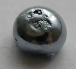 A bead of osmium, about 0.5 cm in diameter, displaying the metal's reflectivity