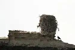 Generally, ospreys reach sexual maturity and begin breeding around the age of three to four, though in some regions with high osprey densities, such as Chesapeake Bay in the United States, they may not start breeding until five to seven years old, and there may be a shortage of suitable tall structures. If there are no nesting sites available, young ospreys may be forced to delay breeding. To ease this problem, posts are sometimes erected to provide more sites suitable for nest building.[54] The nesting platform design developed by the organization Citizens United to Protect the Maurice River and Its Tributaries, Inc. has become the official design of the State of New Jersey, U.S. The nesting platform plans and materials list, available online, have been utilized by people from a number of different geographical regions.[55] There is a global site for mapping osprey nest locations and logging observations on reproductive success.[56]