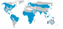 The osprey is the second most widely distributed raptor species, after the peregrine falcon, and is one of only six land-birds with a worldwide distribution.[34] It is found in temperate and tropical regions of all continents, except Antarctica. In North America it breeds from Alaska and Newfoundland south to the Gulf Coast and Florida, wintering further south from the southern United States through to Argentina.[35] It is found in summer throughout Europe north into Ireland, Scandinavia, Finland and Great Britain though not Iceland, and winters in North Africa.[36] In Australia it is mainly sedentary and found patchily around the coastline, though it is a non-breeding visitor to eastern Victoria and Tasmania.[37]
