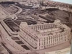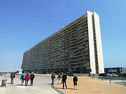 After the successful invasion of Belgium and the occupation, the Germans decided to demolish the remnants of the Kursaal and build a bunker underneath its remains. They also decided to enact the massive Atlantic Wall in the city and heavily reinforced and defended it due to its strategic location.[20][21][22] The city was liberated by Canadian troops on 8 September 1944.[23][24][25][26] Ultimately, the many German and British raids on Ostend ended up destroying many historic houses as well as iconic buildings along the coast as well as in the inner city like the city hall, Kursaal, post office and Hippodrome Wellington.[27] No other Belgian city was bombed as often and faced as much destruction as Ostend: 407 Allied bombs were dropped on the city, making Ostend the most bombed city in Belgium.[28] Because of this, many of the damaged houses and public buildings were left standing in the city for years.[29] It was ultimately decided that the remnants of said buildings, such as civilian houses and luxury hotels, would be torn down instead of restored after the war and reconstructed with modernist apartment blocs due to an increasing demand in these types of buildings from the tourist sector.[30][31]