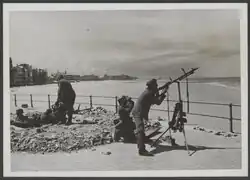 Ostend was once again a target at the start of World War II by both the Axis and Allied powers. The city would face repeated bombing raids by the Luftwaffe during the German invasion of Belgium on 10 May 1940, destroying significant parts of the historic coastline in the process. As early as 13 and 15 May, German bombs fell in the evening and night around Fort Napoleon and the water tower in the Vuurtorenwijk. On the 17th of May more bombs were dropped, with the freight station on the Istanbul quay being hit as a result.[9][10] Around this time, the fear that Ostend would be bombed heavily by the Luftwaffe started to form, prompting many to flee the city by boat to England or France.[11] The 21st of May was the scene of another air raid on Ostend, causing big fires as a result. One of such fires was at Hotel Splendid on the corner of the Kemmelbergstraat.[12] The beach hotel of Ostend was hit by three German bombs on the 24th of May. The hotel was used as a hospital and killed over 50 Belgian soldiers after a massive fire broke out.[13] The next day, the 25th of May, another German bombing raid was carried out. At around 08:00 in the morning, incindiary and bisance bombs were dropped on the city, causing around 3 to 4 fires and killing 12 civilians as a result.[14] The last bombing raid on the 27th of May ended up completely destroying the city hall of Ostend at the Wapenplein as well as the city archive and paintings created by James Ensor and Léon Spilliaert.[15][16][17] In total, the bombing raids between the 21st until the 27th of May caused over 75 deaths of civilians and soldiers in the city.[18] After the German bombings stopped in May 1940, Allied bombings started in June of that year. The Royal Air Force repeatedly targeted the city due to British fears that Germany would use the strategic coastal city for a German invasion of England. As a result, more civilians died and even more of the coastline and inner city, as well as the harbour, ended up being damaged or destroyed.[19]
