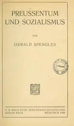 Prussianism and Socialism (German: Preußentum und Sozialismus [ˈpʁɔʏsn̩tuːm ʔʊnt zotsi̯aˈlɪsmʊs]) is a 1919 book by Oswald Spengler originally based on notes intended for the second volume of The Decline of the West, in which he argues for "Prussian" socialism, characterized by an emphasis on social roles rather than capital, in contrast to mainstream socialism, which he refers to as "English" socialism.[46][47]