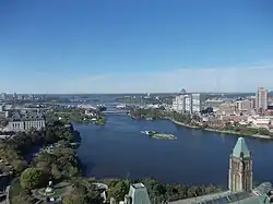 The Ottawa River has large areas of wetlands. Some of the more biologically important wetland areas include (going downstream from Pembroke), the Westmeath sand dune/wetland complex, Mississippi Snye, Breckenridge Nature Reserve, Shirleys Bay, Ottawa Beach/Andrew Haydon Park, Petrie Island, the Duck Islands[12] and Greens Creek.[13][14] The Westmeath sand dune/wetland complex is significant for its relatively pristine sand dunes, few of which remain along the Ottawa River, and the many associated rare plants. Shirleys Bay has a biologically diverse shoreline alvar, as well as one of the largest silver maple swamps along the river. Like all wetlands, these depend upon the seasonal fluctuations in the water level.[15] High water levels help create and maintain silver maple swamps,[16] while low water periods allow many rare wetland plants to grow on the emerged sand and clay flats.[17] There are five principal wetland vegetation types. One is swamp, mostly silver maple. There are four herbaceous vegetation types, named for the dominant plant species in them: Scirpus, Eleocharis, Sparganium and Typha.[18] Which type occurs in a particular location depends upon factors such as substrate type, water depth, ice-scour and fertility. Inland, and mostly south of the river, older river channels, which date back to the end of the ice age, and no longer have flowing water, have sometimes filled with a different wetland type, peat bog. Examples include Mer Bleue and Alfred Bog.[13]