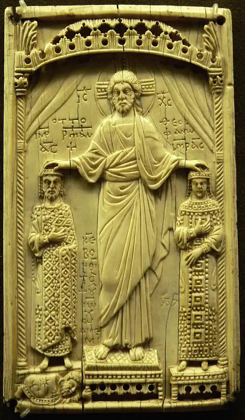 Jesus blesses the marriage of Otto (left) and Theophanu (right) on an ivory book cover, dated to AD 982/3