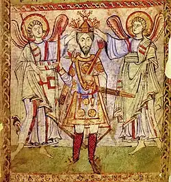 Otto II's support of Charles, however, infuriated the French king, who claimed the Duchy as his own territory.[3] Charles and Lothair were also feuding, with Charles being exiled from France over an infidelity allegation he had made against Lothair's wife. Charles fled to Otto II's court and paid homage to Otto II. In return, Otto II appointed Charles as Duke and promised to support his claim to the French throne. Soon after Otto II crushed Henry II's revolt in the south, the Emperor and his wife Theophanu returned to the old capital of Aachen in Lorraine. With the Imperial family near the French border, Lothair invaded Lorraine and marched on Aachen.[8] With the French army in sight, Otto II and Theophanu fled to Cologne and then to the Duchy of Saxony. Upon hearing of the French invasion, Otto II's mother Adelaide of Italy, who was Lothair's mother-in-law, sided with Lothair over her own son and moved to the court of her brother King Conrad of Burgundy.[6] After occupying Aachen for five days, Lothair returned to France after symbolically disgracing the city.