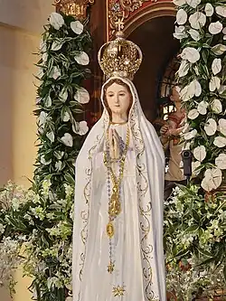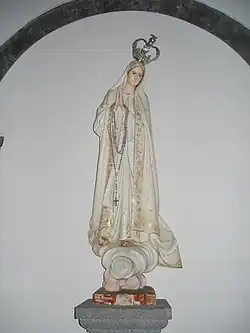 The image that is venerated today was "with minor changes in detail" inspired by an existing image of Our Lady of Lapa.[157] Manuel Nunes Formigão commented: "Our Lady can only appear as decently and modestly dressed as possible. The dress should go down to about her feet".[158] The length of the skirt was something scandalous for the times;[159] and Rev.Formigão said it was the most serious difficulty to the supernaturality of the apparition, maybe a mystification by the "spirit of darkness".[158]