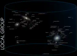 Estimates put the average energy density of the present day universe at the equivalent of 5.9 protons per cubic meter, including dark energy, dark matter, and baryonic matter (ordinary matter composed of atoms). The atoms account for only 4.6% of the total energy density, or a density of one proton per four cubic meters.[25] The density of the universe is clearly not uniform; it ranges from relatively high density in galaxies—including very high density in structures within galaxies, such as planets, stars, and black holes—to conditions in vast voids that have much lower density, at least in terms of visible matter.[26] Unlike matter and dark matter, dark energy seems not to be concentrated in galaxies: although dark energy may account for a majority of the mass-energy in the universe, dark energy's influence is 5 orders of magnitude smaller than the influence of gravity from matter and dark matter within the Milky Way.[27]