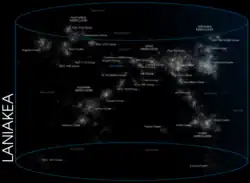 The plasma between galaxies is thought to account for about half of the baryonic (ordinary) matter in the universe, having a number density of less than one hydrogen atom per cubic metre and a kinetic temperature of millions of kelvins.[4] Local concentrations of matter have condensed into stars and galaxies. Intergalactic space takes up most of the volume of the universe, but even galaxies and star systems consist almost entirely of empty space. Most of the remaining mass-energy in the observable universe is made up of an unknown form, dubbed dark matter and dark energy.[5][6][7]