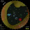 Interplanetary space within the Solar System is dominated by the gravitation of the Sun, outside the gravitational spheres of influence of the planets.[139] Interplanetary space extends well beyond the orbit of the outermost planet Neptune, all the way out to where the influence of the galactic environment starts to dominate over the Sun and its solar wind producing the heliopause at 110 to 160 AU.[140] The heliopause deflects away low-energy galactic cosmic rays, and its distance and strength varies depending on the activity level of the solar wind.[141][142] The solar wind is a continuous stream of charged particles emanating from the Sun which creates a very tenuous atmosphere (the heliosphere) for billions of kilometers into space. This wind has a particle density of 5–10 protons/cm3 and is moving at a velocity of 350–400 km/s (780,000–890,000 mph).[143]