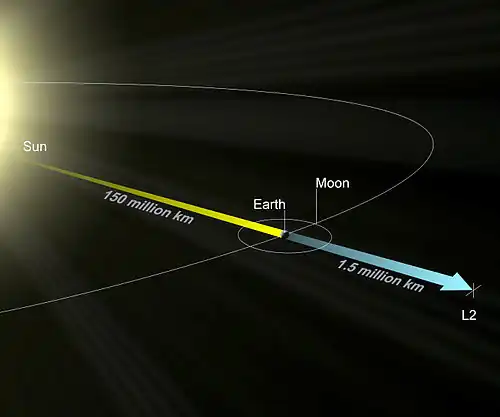 Cislunar space is a region outside of Earth that includes lunar orbits, the Moon's orbital space around Earth and the Earth-Moon Lagrange points.[117] The region where a body's gravitational potential remains dominant against gravitational potentials from other bodies, is the body's sphere of influence or gravity well, mostly described with the Hill sphere model.[130] In the case of Earth this includes all space from the Earth to a distance of roughly 1% of the mean distance from Earth to the Sun,[131] or 1.5 million km (0.93 million mi). Beyond Earth's Hill sphere extends along Earth's orbital path its orbital and co-orbital space. This space is co-populated by groups of co-orbital Near-Earth Objects (NEOs), such as horseshoe librators and Earth trojans, with some NEOs at times becoming temporary satellites and quasi-moons to Earth.[132]