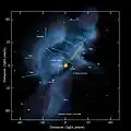 Interstellar space is the physical space outside of the bubbles of plasma known as astrospheres, formed by stellar winds originating from individual stars.[148] It is the space between the stars or stellar systems within a nebula or galaxy.[149] Interstellar space contains an interstellar medium of sparse matter and radiation. The boundary between an astrosphere and interstellar space is known as an astropause. For the Sun, the astrosphere and astropause are called the heliosphere and heliopause, respectively.[150]