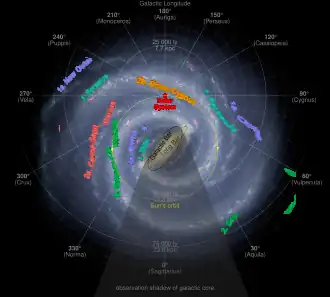 The local interstellar medium is a region of space within 100 pc of the Sun, which is of interest both for its proximity and for its interaction with the Solar System. This volume nearly coincides with a region of space known as the Local Bubble, which is characterized by a lack of dense, cold clouds. It forms a cavity in the Orion Arm of the Milky Way Galaxy, with dense molecular clouds lying along the borders, such as those in the constellations of Ophiuchus and Taurus. The actual distance to the border of this cavity varies from 60 to 250 pc or more. This volume contains about 104–105 stars and the local interstellar gas counterbalances the astrospheres that surround these stars, with the volume of each sphere varying depending on the local density of the interstellar medium. The Local Bubble contains dozens of warm interstellar clouds with temperatures of up to 7,000 K and radii of 0.5–5 pc.[156]