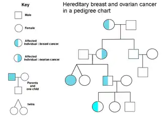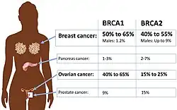 The major genetic risk factor for ovarian cancer is a mutation in BRCA1 or BRCA2 genes, or in DNA mismatch repair genes, which is present in 10% of ovarian cancer cases. Only one allele needs to be mutated to place a person at high risk. The gene can be inherited through either the maternal or paternal line, but has variable penetrance.[26][29] Though mutations in these genes are usually associated with increased risk of breast cancer, they also carry a substantial lifetime risk of ovarian cancer, a risk that peaks in a person's 40s and 50s. The lowest risk cited is 30% and the highest 60%.[28][26][29] Mutations in BRCA1 have a lifetime risk of developing ovarian cancer of 15–45%.[31] Mutations in BRCA2 are less risky than those with BRCA1, with a lifetime risk of 10% (lowest risk cited) to 40% (highest risk cited).[26][31] On average, BRCA-associated cancers develop 15 years before their sporadic counterparts because people who inherit the mutations on one copy of their gene only need one mutation to start the process of carcinogenesis, whereas people with two normal genes would need to acquire two mutations.[29]