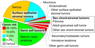 - Minor adjustment for mature cystic teratomas (0.17 to 2% risk of ovarian cancer): Mandal S, Badhe BA (2012). "Malignant transformation in a mature teratoma with metastatic deposits in the omentum: a case report". Case Reports in Pathology. 2012 568062. doi:10.1155/2012/568062. PMC 3469088. PMID 23082264. - ^ a b c Gaona-Luviano P, Medina-Gaona LA, Magaña-Pérez K (August 2020). "Epidemiology of ovarian cancer". Chinese Clinical Oncology. 9 (4): 47. doi:10.21037/cco-20-34. PMID 32648448. S2CID 220465461.