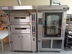 Industrial Zanolli double hearth deck oven (left) and Sveba-Dahlen rotary rack oven (right)