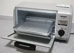 Toaster ovens are small electric ovens with a front door, wire rack and removable baking pan. To toast bread with a toaster oven, slices of bread are placed horizontally on the rack. When the toast is done, the toaster turns off, but in most cases the door must be opened manually. Most toaster ovens are significantly larger than toasters, but are capable of performing most of the functions of electric ovens, albeit on a much smaller scale.