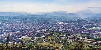 Oviedo is located approximately 24 km (15 mi) southwest of Gijón[3] and 23 km (14 mi) southeast of Avilés,[4] both of which lie on the shoreline of the Bay of Biscay. Oviedo's proximity to the ocean of less than 30 kilometres (19 mi) in combination with its elevated position with areas of the city more than 300 metres above sea level causes the city to have a maritime climate, even though it does not sit directly on the shore.