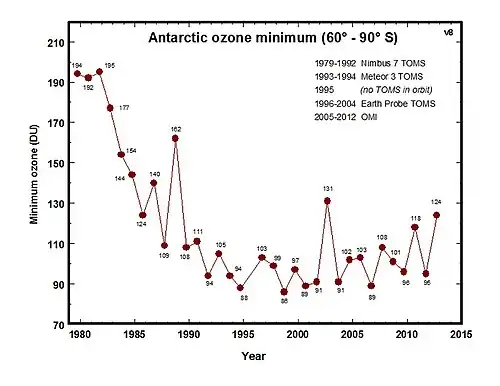 Reductions of up to 70 percent in the ozone column observed in the austral (Southern Hemispheric) spring over Antarctica and first reported in 1985 (Farman et al.) are continuing. As of 2010, Antarctic total column ozone in September and October continued to be 40–50 percent lower than pre-ozone-hole values since the 1990s.[1] A gradual trend toward "healing" was reported in 2016.[24] In 2017, NASA announced that the ozone hole was the weakest since 1988 because of warm stratospheric conditions. It is expected to recover around 2070.[25]