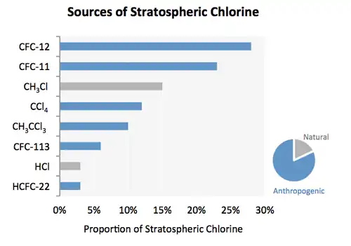 While all of the relevant radicals have both natural and man-made sources, human activity has impacted some more than others. As of 2020, most of the OH· and NO· in the stratosphere is naturally occurring, but human activity has drastically increased the levels of chlorine and bromine.[17] These elements are found in stable organic compounds, especially chlorofluorocarbons, which can travel to the stratosphere without being destroyed in the troposphere due to their low reactivity. Once in the stratosphere, the Cl and Br atoms are released from the parent compounds by the action of ultraviolet light, e.g.
