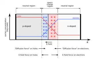 For a p–n junction, let be the concentration of negatively-charged acceptor atoms and be the concentrations of positively-charged donor atoms. Let and be the equilibrium concentrations of electrons and holes respectively. Thus, by Poisson's equation: