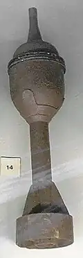 Although the technology existed, it remained for British designers to develop a system that could deliver shaped charge ammunition in a larger size and with a greater range than that possessed by the No. 68. At the same time that Mohaupt was developing shaped charge ammunition, Lieutenant Colonel Stewart Blacker of the Royal Artillery was investigating the possibility of developing a lightweight platoon mortar.[10] However, rather than using the conventional system of firing the mortar shell from a barrel fixed to a baseplate, Blacker wanted to use the spigot mortar system. Instead of a barrel, there was a steel rod known as a "spigot" fixed to a baseplate, and the bomb itself had a propellant charge inside its tail. When the mortar was to be fired, the bomb was pushed down onto the spigot, which exploded the propellant charge and blew the bomb into the air.[10] By effectively putting the barrel on the inside of the weapon, the barrel diameter was no longer a limitation on the warhead size.[11] Blacker eventually designed a lightweight mortar that he named the "Arbalest" and submitted it to the War Office,[12] but it was turned down in favour of a Spanish design. Undeterred, however, Blacker continued with his experiments and decided to try to invent a hand-held anti-tank weapon based on the spigot design, but found that the spigot could not generate sufficient velocity needed to penetrate armour. But he did not abandon the design, and eventually came up with the Blacker Bombard, a swivelling spigot-style system that could launch a 20-pound (9 kg) bomb approximately 100 yards (90 m). Although the bombs it fired could not actually penetrate armour, they could still severely damage tanks, and in 1940 a large number of Blacker Bombards were issued to the Home Guard as anti-tank weapons.[13]
