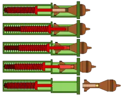When the trigger was pulled, the spring pushed the spigot rod (which has a fixed firing pin on the end) forwards into the bomb, which aligned the bomb, ignited the propellant cartridge in the bomb and launched it along the rod and into the air. The recoil caused by the detonation of the propellant blew the spigot rod backwards onto the spring, similar to that of a blowback operation; this reduced the shock of recoil and automatically cocked the weapon for subsequent shots, eliminating the need to manually re-cock.[8][22]