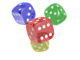 A PNG image of four differently colored dice with an 8-bit transparency channel, overlaid onto a checkered background, typically used in graphics software to indicate transparency