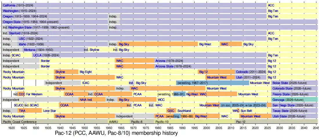 No school had left the Pac-12 from its founding as the AAWU in 1959 until 2024, when 10 of its 12 schools left. Two members of the PCC, Idaho and Montana, were not invited to join the AAWU or its successors.
