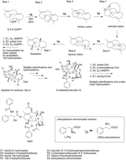 Taxol is a tetracyclic diterpene, and the biosynthesis of diterpenes starts with an FPP molecule being elongated by the addition of an IPP molecule in order to form geranylgeranyl diphosphate (GGPP).[45] The biosynthesis of Taxol contains nineteen steps.[46] These 19 steps can be considered in several steps, with the first step being the formation of the taxane skeleton, which then undergoes a series of oxygenations. Following the oxygenations, two acetylations and a benzoylation occur on the intermediate. The oxygenation of the taxane core is believed to occur on C5 and C10, C2 and C9, C13 followed by C7, and a C1 hydroxylation later on in the pathway. Later in the pathway, an oxidation at C9 forms a ketone functional group and an oxetane, forming the intermediate baccatin III. The final steps of the pathway include the formation of a C13-side chain which is attached to baccatin III.[47] The biosynthesis of Taxol is illustrated in more detail in the figure, with steps 1-7 all occurring in the enzyme taxadiene synthase (TS on the figure). Taxol's biosynthesis begins with E,E,E-GGPP losing pyrophosphate via an SN1 mechanism (step 1 in the figure). The double-bond attacks the cation via electrophilic addition, yielding a tertiary cation and creating the first ring closure (step 2). Another electrophilic attack occurs, further cyclizing the structure by creating the first 6-membered ring and creating another tertiary cation (step 3). An intramolecular proton transfer occurs, attacking the verticillyl cation (step 4) and creating a double bond, yielding a tertiary cation. An electrophilic cyclization occurs in step 5, and an intramolecular proton transfer attacks the taxenyl cation (step 6). This forms the fused ring structure intermediate known as taxadiene. Taxadiene then undergoes a series of 10 oxidations via NADPH, forming the intermediate taxadiene-5α-acetoxy-10β-ol (multiple steps later in the figure). A series of hydroxylations and esterficiations occur, forming the intermediate 10-deacetyl-baccatin III, which undergoes a further series of esterifications and a side-chain hydroxylation.[45] This finally yields the product paclitaxel.