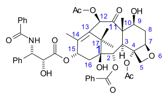 • CC1=C2[C@@]([C@]([C@H]([C@@H]3[C@]4([C@H](OC4)C[C@@H]([C@]3(C(=O)[C@@H]2OC(=O)C)C)O)OC(=O)C)OC(=O)c5ccccc5)(C[C@@H]1OC(=O)[C@H](O)[C@@H](NC(=O)c6ccccc6)c7ccccc7)O)(C)C