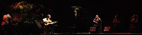 In 1982, de Lucía put on a series of concerts with jazz pianist Chick Corea.[37] Corea was a considerable influence on him in the 1980s and he and McLaughlin adapted a version of his piece "Spain", performing it live together several times in the mid to late 1980s. He released a "Golden" double compilation album in 1982, La Guitarra de Oro de Paco de Lucía, covering de Lucía's earliest recordings with Ricardo Modrego of Federico García Lorca songs to date, and featured two siguiriyas, a flamenco form in which he had not indulged in his recordings since 1972.[43]