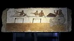 The remaining four walls of the tomb are occupied by symposium-related scenes, an iconography far more familiar from Greek pottery than the diving scene. All the five frescoes are displayed in the museum, together with other cycles from Lucanian painted tombs. In contrast to earlier Greek tomb paintings, these later scenes have many figures and a high proportion of scenes including horses and equestrian sports.