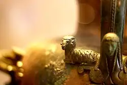 The heroön, close to the forum and the Temple of Athena, probably celebrated the founder of the city, though constructed around a century after the death of this unnamed figure. It was a low tumulus with a walled rectangular enclosure faced with large stones around it. When it was excavated in 1954 a low stone chamber with a pitched roof was discovered at the centre, half below the surrounding ground level and half above. This contained several large, rare, and splendid bronze vessels, perhaps not locally made, and a large Athenian pottery black-figure amphora of about 520–500 BCE. The bronze vessels had traces of honey inside. These are all now in the museum.[13]
