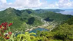 Pago Pago was first settled 4,000 years ago.[37] The area was initially settled by Polynesian navigators, who established a vibrant community rooted in agriculture, fishing, and the distinct cultural practices of Samoan society.[27] There is archeological evidence of people living in the Pago Pago Valley at least 1500–1300 years ago.[38] The ancient people of Tutuila produced clay pottery known as Samoan Plainware. The majority of these open bowls had plain designs and featured rounded bases. Such pottery has been retrieved from sites in Pago Pago, including at Vaipito. The production of such pottery ceased approximately 1500 years ago.[39][40] A site in the Vaipito Valley has also revealed more substantial elements, such as constructions made from rocks, like house foundations and terraces (lau mafola).[41][42]