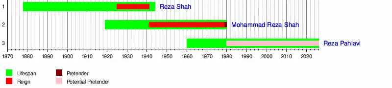 Reign of Pahlavi monarchs and tenure of later pretenders; and their lifespan