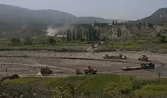 ![]() The Afghan national flag (2002-2021) overlooks a valley from an observation post at Paktika province in Afghanistan | |