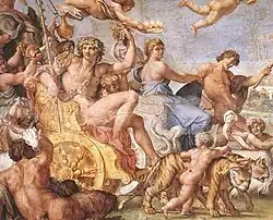 One of the vault and ceiling frescoes by Annibale Carracci is Galleria Farnese, an art gallery. According to Ann Sutherland Harris, "The Galleria frescoes make even more extensive use of ancient sculptural and architectural sources, and in addition take their basic structure from two ceilings by the most prestigious artists of the High Renaissance in Rome, the Loggia of Psyche by Raphael and Michelangelo's Sistine Chapel ceiling". Carracci adopted the quadri riportati, which the ceiling is divided into units and turned it into a collection of framed paintings, along with the cast masks among the garlands, and carved putti, and sculptures supporting the central scene. This large central scene depicts the triumphal progress of Bacchus and Ariadne. Two smaller paintings are attached to the top and bottom of the central picture, and two vertical pictures on either side, filled with sphinxes, Pan, and two satyrs.