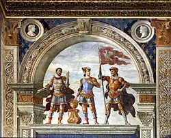 Fresco by Ghirlandaio of abtique heroes Brutus, Gaius Mucius Scaevola and Camillus (1482–84), in the Hall of Lilies