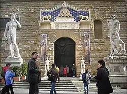 Michelangelo's David also stood at the entrance from its completion in 1504 to 1873, when it was moved to the accademia Gallery. A replica erected in 1910 now stands in its place, flanked by Baccio Bandinelli's Hercules and Cacus. The statuary present at the entrance of the Palazzo Vecchio is a testament to the fluctuating political atmosphere in Florence from 1504 to 1534, when Michelangelo's David and Bandinelli's Hercules and Cacus were created, respectively. The statuary in front of this political building was commissioned under two different rulers in Florence, David under Piero Soderini and Hercules and Cacus under the Medici. These statues, thus engage in a fierce dialogue with each other as well as the Florentine public about the socio-political state of Florence under each of the rulers. The statues at the entrance were installed next to each other to perpetuate different political agendas depending on their patron and demonstrate superiority from one regime to the next.[4]